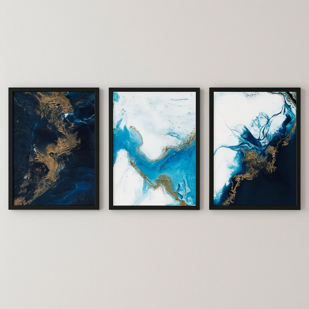 Luxusní trojdílné dílo inspirované krásou mramoru, které hladce kombinuje výraznou dekoraci s moderní estetikou. Každá z tří MDF desek (velikost 36 × 51 cm) je vyrobena s precizností a důrazem na detail, rámovaná výrazným černým PVC rámem (tloušťka 22 mm). Při společné instalaci působí jako působivý celek o celkovém rozměru cca 112 × 51 cm.