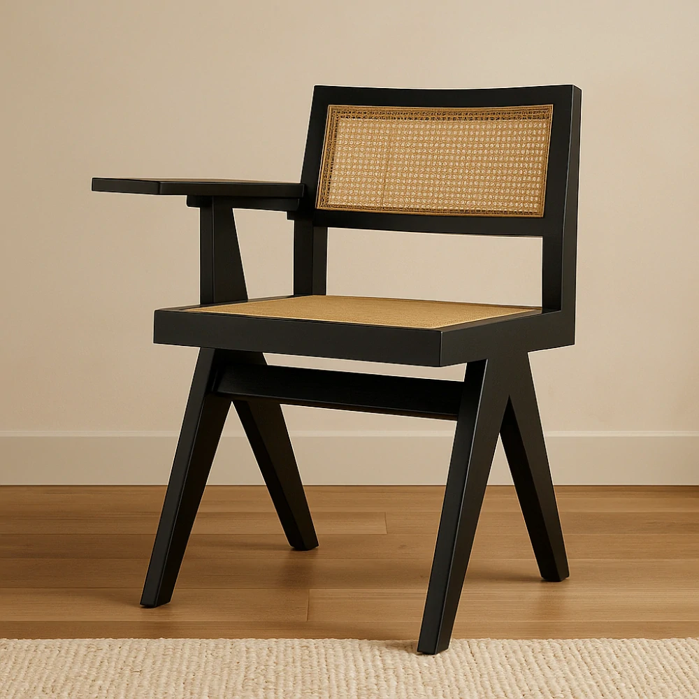 Elegantní kombinace designového sezení a praktického stolku – Eichholtz Niclas Chair with Desk v černé variantě je inspirována ikonickými návrhy Pierre Jeannereta. Rám z lakovaného mindi dřeva doplňuje ručně tkaný ratanový výplet, který poskytuje jemnou texturu a lehkost. Funkční integrovaný stolek je ideální pro práci i odložení drobností, což z něj činí perfektní řešení pro malé domácí kouty či stylové pracovní zóny