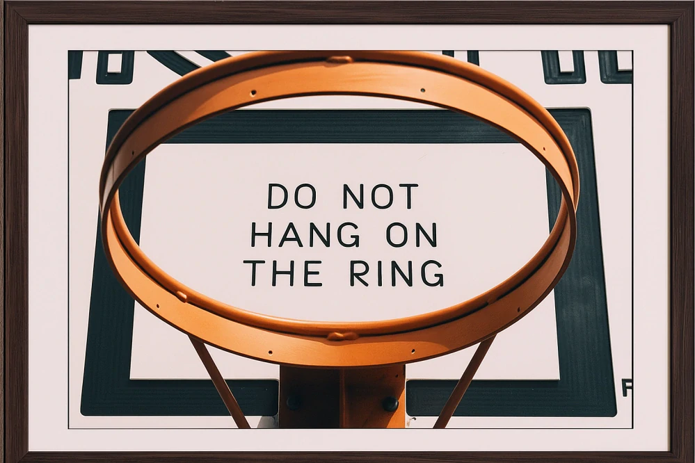 Tento výrazný fotografický plakát zachycuje záběr z basketbalového hřiště s nápisem “Do not hang on the ring”, a nabízí vizuálně silný, zároveň minimalistický motiv s jemným humorem a designovou čistotou.